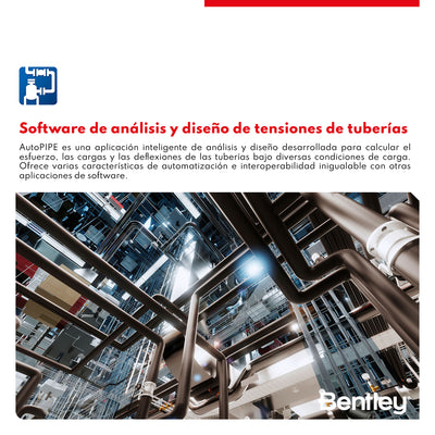DESCRIPCIÓN AutoPIPE es una aplicación de análisis y diseño que se utiliza para calcular tensiones, cargas y deflexiones de tuberías en condiciones de carga estática y dinámica. Con una amplia interoperabilidad con otras aplicaciones de la industria, así como funciones que ahorran tiempo como el nuevo optimizador de soporte, AutoPIPE ayuda a garantizar diseños de calidad y rentables, y un flujo de trabajo sin problemas para los ingenieros que lo utilizan. Disponible en versión perpetua y suscripción anual Virtuosity. CARACTERÍSTICAS BENTLEY AutoPipe • Modele, analice y visualice los esfuerzos en tuberías Mejore la eficiencia con el modelado interactivo de "apuntar y hacer clic" orientado a objetos. Ahorre tiempo y mejore la uniformidad gracias a la sólida integración de AutoPIPE con todos los principales sistemas CAD 3D inteligentes. También configure, analice y visualice resultados con rapidez para diversos escenarios de carga, incluidos casos de carga térmicos, sísmicos, eólicos y dinámicos (espectros de respuesta). • Revise la interoperabilidad estructural y las interferencias ocasionadas por esfuerzos en tuberías Mejore la precisión del modelo y represente mejor las centrales o plantas al incluir la rigidez estructural del soporte en el modelo de la tubería, y pase las cargas de reacción del soporte a STAAD.Pro. Analice cualquier condición de carga estática o dinámica aplicada a tuberías y estructuras, encuentre los desplazamientos operativos de los esfuerzos de las tuberías y compárelos con todo el modelo de la central. • Cumpla con los códigos y las normas de la industria Asegúrese de que sus proyectos cumplan con los principales códigos de tuberías metálicas estadounidenses (ASME) y europeos (EN). El software incluye normas API, NEMA, ANSI, ASCE, AISC, UBC, ISO y WRC y límites de carga de diseño. AutoPIPE hace fácilmente accesible la norma ASME B31J para calcular la flexibilidad y los factores de intensificación de esfuerzo de ASME B31J tan sólo con una simple casilla de verificación. ESPECIFICACIONES ⨭ Ahorre tiempo con una aplicación fácil de usar ⨭ Realizar análisis y diseño avanzados ⨭ Crear resultados gráficos e informes ⨭ Optimice los flujos de trabajo multidisciplinarios ⨭ Optimizar los soportes de las tuberías VIDEOS DESCARGAS Descargar Datasheet
