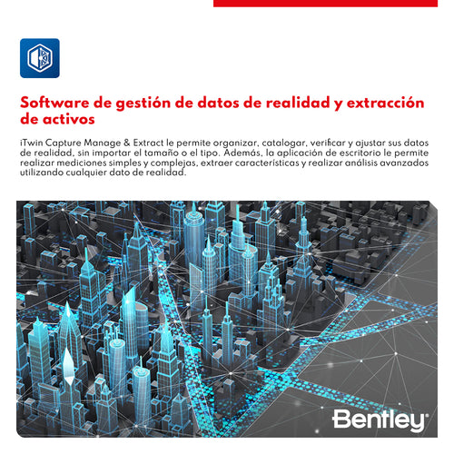 DESCRIPCIÓN iTwin Capture Manage & Extract le permite organizar, catalogar, verificar y ajustar sus datos de realidad, sin importar el tamaño o el tipo. Además, la aplicación de escritorio le permite realizar mediciones simples y complejas, extraer características y realizar análisis avanzados utilizando cualquier dato de realidad. Disponible en versión perpetua y suscripción anual Virtuosity CARACTERÍSTICAS BENTLEY iTwin Capture Manage & Extract • Datos de realidad y SIG tradicionales Escalable e independiente de hardware y cualquier software de posprocesamiento, iTwin Capture Manage & Extract le permite tomar cantidades masivas de imágenes esféricas, imágenes planas, imágenes oblicuas, nubes de puntos y mallas texturizadas, y combinarlas con recursos de SIG tradicionales, como datos vectoriales, ortofotos e imágenes ráster. Importe datos de realidad capturados con sistemas de mapas terrestres, móviles y aéreos, tomados en carreteras, ferrocarriles, agua y aire, tanto en interiores como en exteriores, y sobre el suelo y bajo tierra. • Visualice y navegue Vea y navegue sus datos de cartografía en 2D o 3D, reproduzca automáticamente todas las imágenes compatibles, y superponga cualquier dato vectorial en 2D y 3D. iTwin Capture Manage & Extract le permite configurar varias opciones de leyenda de nube de puntos, como la transparencia y la profundidad de la vista. Al definir los modos de visualización de nubes de puntos puede ver vistas estéreo, de perspectiva e isométricas en 3D. También puede superponer de manera eficaz sus datos de nubes de puntos en imágenes con capacidades de cursor colorizadas para detectar superficies subyacentes, hacer referencia al punto más cercano e interpolar entre puntos para rastrear superficies, bordes y esquinas. • Gestione, catalogue y ajuste datos de realidad iTwin Capture Manage & Extract le permite gestionar, catalogar, acceder, ajustar y verificar sus datos de realidad. Las plantillas inteligentes simplifican y permiten la automatización para importar sus datos de realidad desde cualquier sistema de captura y software de posprocesamiento. Verifique y corrija la precisión de los datos de captura con puntos de control del terreno, ajuste de trayectoria y herramientas para la calibración posterior a la recolección. Catalogue y organice sus datos, y, luego, complete los metadatos y el etiquetado para mantener la visión general de su proyecto, y obtener acceso fácil a cualquier dato en cualquier momento. • Extraiga activos y análisis avanzados iTwin Capture Manage & Extract le permite realizar mediciones simples y complejas, extraer características y realizar análisis avanzados. Puede realizar mediciones con cualquier dato de realidad y extraerlos en características SIG. Cree y verifique su inventario de activos. Realice mediciones manuales, semiautomatizadas y completamente automatizadas con datos de nubes de puntos, en combinación con flujos de trabajo orientados a objetos y análisis específicos de dominio, como distancia de puentes, detección de incompatibilidades, perfiles y secciones transversales, y análisis de baches de carreteras. • Trabajo en equipo con una base de datos centralizada Los operadores pueden trabajar de forma independiente o colaborar para convertirse en equipos eficientes de producción de características. Los directores de equipo pueden configurar su unidad de producción, importar datos de realidad, preparar el flujo de trabajo de extracción de características y gestionar espacios de trabajo para múltiples operadores. Los activos extraídos se pueden almacenar en la base de datos centralizada que proporciona ajustes en tiempo real para todos los operadores. Se pueden agregar o adjuntar metadatos adicionales, información de atributos, documentos y fotografías. Los procedimientos simples maximizan la productividad del operador. La actividad del equipo y los usuarios se registra para crear informes y obtener perspectivas para afinar su producción. ESPECIFICACIONES ⨭ Medir y extraer características de imágenes, nubes de puntos, mallas de realidad, dem y referencias vectoriales ⨭ Mediciones por nubes de puntos, mallas, dem, planos de referencia e intersección hacia adelante ⨭ Reconoce automáticamente puntos, superficies, crestas y esquinas. ⨭ Aplicar mediciones asistidas y automatizadas ⨭ Utilice herramientas avanzadas para la extracción de características de datos de nubes de puntos ⨭ Genere flujos de trabajo de extracción de características rápidos y eficientes ⨭ Generar y exportar perfiles y secciones transversales ⨭ Detección automática de postes y señales de tráfico ⨭ Crear planos de planta en 2D ⨭ Calcular y reportar volúmenes 2.5D ⨭ Caja de herramientas de datos vectoriales SIG ⨭ Guardar mediciones en GIS y exportarlas a CAD VIDEOS DESCARGAS Descargar Datasheet