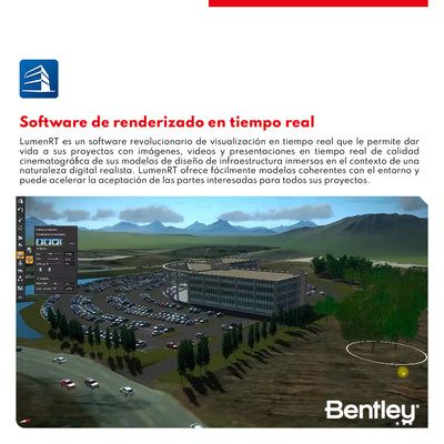 DESCRIPCIÓN LumenRT es un software revolucionario de visualización en tiempo real que le permite dar vida a sus proyectos con imágenes, videos y presentaciones en tiempo real de calidad cinematográfica de sus modelos de diseño de infraestructura inmersos en el contexto de una naturaleza digital realista. LumenRT ofrece fácilmente modelos coherentes con el entorno y puede acelerar la aceptación de las partes interesadas para todos sus proyectos. Disponible en versión perpetua y suscripción anual Virtuosity. CARACTERÍSTICAS BENTLEY LumenRT • Integración con flujos de trabajo CAD, SIG y BIM Cree fácilmente vistas de LumenRT desde MicroStation, Autodesk Revit y Trimble SketchUp con la sincronización de flujos de trabajo. • Cree imágenes y videos de alta fidelidad de la infraestructura. Produzca luz y sombras que tengan una apariencia natural incluso en elementos en movimiento, como tráfico simulado, personas en movimiento y elementos naturales de temporada. • Comparta sus creaciones Agilice la aprobación de las partes interesadas con presentaciones 3D interactivas e inmersivas mediante el uso de Bentley LumenRT LiveCubes y Web Project Tours. ESPECIFICACIONES ⨭ Integración con flujos de trabajo BIM, CAD y geoespaciales ⨭ Disfrute de la integración de API con MicroStation, Autodesk Revit, Esri CityEngine, Graphisoft ArchiCAD y Trimble SketchUp ⨭ Asegúrese de que los cambios en el modelo geoespacial/CAD de origen se fusionen de forma inteligente en LiveCube mientras se conservan la geometría y las ediciones de la escena existentes. ⨭ Agregue planos de sección para crear dinámicamente vistas de secciones transversales de toda la escena ⨭ Importar objetos utilizando formatos 3D estándar de la industria (OBJ, DAE, FBX) ⨭ Exportar geometrías, materiales, proxies LumenRT, luces, cámaras, capas e información BIM ⨭ Crea escenas extensas en alta definición sin perder calidad ni aumentar el tiempo de renderizado VIDEOS