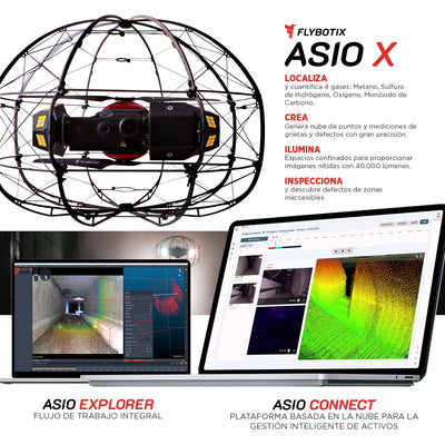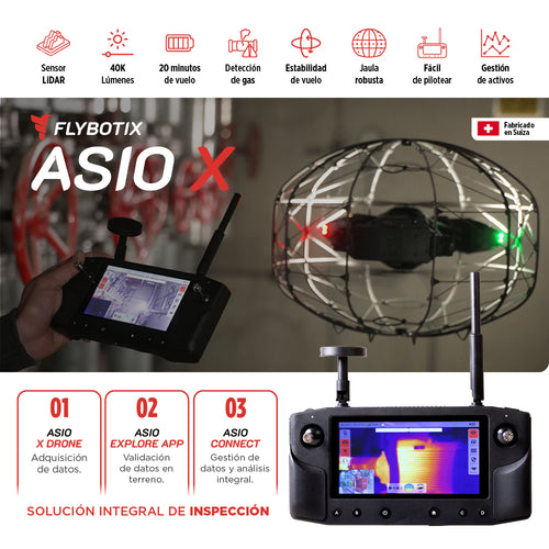 DESCRIPCIÓN El dron ASIO X está diseñado para que sea fácil de volar, sus controles intuitivos y su interfaz, ayudan a una excelente experiencia en el vuelo. El dron está equipado con una variedad de vuelos que facilitan su control, incluso en condiciones adversas. Flybotix ASIO X está fabricado con una jaula robusta que lo protege de daños en entornos muy difíciles. Esto garantiza un vuelo, sin importar las condiciones existentes. La jaula está fabricada de un material liviano y duradero que puede soportar impactos y rayones. CARACTERÍSTICAS Flybotix ASIO X LIDAR INTEGRADO Genera nubes de puntos y mediciones altamente precisas de grietas y defectos. ILUMINACIÓN ULTRABRILLANTE Ilumina espacios confinados para proporcionar imágenes nítidas y cristalinas con 40,000 lúmenes, líder en la industria. TIEMPO DE VUELO MÁS LARGO 20 minutos por batería para una inspección completa en un solo vuelo. DETECTOR MULTI-GAS INTEGRADO Detecta, localiza y cuantifica 4 gases: Metano, Sulfuro de Hidrógeno, Oxígeno, Monóxido de Carbono TECNOLOGÍA VIO Utiliza datos de cámaras y sensores inerciales para mantener una posición precisa incluso en entornos donde no se dispone de GPS. SISTEMA DE DOBLE CÁMARA Cámaras duales 4K e IR Radiométrica con campo de visión vertical de 185° sin obstrucciones. ESTABLE EN ENTORNOS HOSTILES Tecnología avanzada de estabilización basada en radar, aumenta el éxito de la inspección en condiciones ambientales difíciles. VIDEOS DESCARGAS Descargar Datasheet