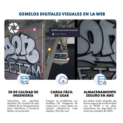 DESCRIPCIÓN Desde cualquier lugar y en cualquier momento La potente y exclusiva tecnología de inteligencia visual de Twinsity mejora radicalmente la forma de inspeccionar y mantener la infraestructura física. Gracias a modelos 3D fotorrealistas y análisis de daños asistidos por IA en una plataforma web potente y segura, los datos de inspección se pueden revisar en cualquier momento y compartir con miembros del equipo internos y externos. Esto mejora la comunicación, la colaboración, la toma de decisiones y la planificación de acciones específicas. Gemelos digitales visuales en la web Twinsity permite a los equipos de expertos acceder, inspeccionar y analizar de forma interactiva modelos de activos en 3D de alta fidelidad e imágenes de inspección con drones de alta calidad. Esto significa la máxima calidad y no se pasará por alto ningún detalle. Los activos complejos y masivos es el punto fuerte. CARACTERÍSTICAS TWINSITY • Modelos fotorrealistas en 3D Visualice, comparta y analice modelos 3D de fotogrametría altamente detallados de marcas líderes como Metashape, ContextCapture, Reality Capture y DJI Terra, sin pérdida de calidad y con máxima resolución. • Modelos 3D Georreferenciados Cargue modelos con información espacial exacta para una alineación precisa y la posibilidad de ver la ubicación de su modelo, imágenes relacionadas, anotaciones y detecciones de IA en el espacio de mapa de proyecto. • Detección de defectos asistida por IA Los potentes modelos de deep learning de la inteligencia artificial de última generación ayudan a los expertos a analizar imágenes RGB y modelos de realidad 3D para crear su propio modelo de IA basado en sus necesidades de detección. • Imágenes de inspección de alta resolución con drones Gestione, almacene y analice las imágenes de inspección de alta resolución en sincronización con los modelos de realidad 3D. De este modo, ayudamos a los técnicos expertos a mantener sus flujos de trabajo actuales. • Anotaciones personalizables Los equipos de inspección pueden definir plantillas de anotaciones personalizadas con sus propios atributos, campos y registros para admitir diversos formatos de registro y normas de inspección. • Informes de inspección detallados Generación automática de informes de inspección en diversos formatos que incluyen todas las anotaciones y mediciones pertinentes, así como imágenes de alta resolución y resúmenes. • Herramientas de anotación y medición Etiquetar y medir defectos y otros registros directamente en el modelo de realidad 3D o en las imágenes originales. Todos los registros se sincronizarán y etiquetarán en todas las imágenes y modelos 3D. VIDEOS DESCARGAS Descargar Datasheet