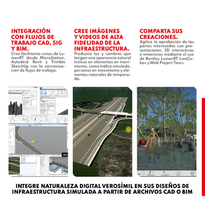 DESCRIPCIÓN LumenRT es un software revolucionario de visualización en tiempo real que le permite dar vida a sus proyectos con imágenes, videos y presentaciones en tiempo real de calidad cinematográfica de sus modelos de diseño de infraestructura inmersos en el contexto de una naturaleza digital realista. LumenRT ofrece fácilmente modelos coherentes con el entorno y puede acelerar la aceptación de las partes interesadas para todos sus proyectos. Disponible en versión perpetua y suscripción anual Virtuosity. CARACTERÍSTICAS BENTLEY LumenRT • Integración con flujos de trabajo CAD, SIG y BIM Cree fácilmente vistas de LumenRT desde MicroStation, Autodesk Revit y Trimble SketchUp con la sincronización de flujos de trabajo. • Cree imágenes y videos de alta fidelidad de la infraestructura. Produzca luz y sombras que tengan una apariencia natural incluso en elementos en movimiento, como tráfico simulado, personas en movimiento y elementos naturales de temporada. • Comparta sus creaciones Agilice la aprobación de las partes interesadas con presentaciones 3D interactivas e inmersivas mediante el uso de Bentley LumenRT LiveCubes y Web Project Tours. ESPECIFICACIONES ⨭ Integración con flujos de trabajo BIM, CAD y geoespaciales ⨭ Disfrute de la integración de API con MicroStation, Autodesk Revit, Esri CityEngine, Graphisoft ArchiCAD y Trimble SketchUp ⨭ Asegúrese de que los cambios en el modelo geoespacial/CAD de origen se fusionen de forma inteligente en LiveCube mientras se conservan la geometría y las ediciones de la escena existentes. ⨭ Agregue planos de sección para crear dinámicamente vistas de secciones transversales de toda la escena ⨭ Importar objetos utilizando formatos 3D estándar de la industria (OBJ, DAE, FBX) ⨭ Exportar geometrías, materiales, proxies LumenRT, luces, cámaras, capas e información BIM ⨭ Crea escenas extensas en alta definición sin perder calidad ni aumentar el tiempo de renderizado VIDEOS