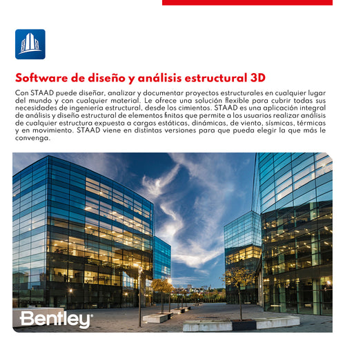 DESCRIPCIÓN STAAD es una aplicación integral de análisis y diseño de elementos finitos estructurales que le proporciona potentes capacidades de visualización y una amplia gama de códigos de diseño internacionales. Las potentes capacidades de análisis de STAAD le permiten realizar análisis en cualquier estructura expuesta a cargas estáticas, dinámicas, eólicas, sísmicas, térmicas y en movimiento. Disponible en versión perpetua y suscripción anual Virtuosity CARACTERÍSTICAS BENTLEY Staad Debido a que cada empresa tiene necesidades diferentes, existen tres variantes flexibles de STAAD: • STAAD.Pro STAAD es una popular aplicación de análisis estructural conocida por sus funciones de análisis, diversas aplicaciones de uso, interoperabilidad y ahorro de tiempo. STAAD ayuda a los ingenieros estructurales a realizar análisis y diseños estructurales 3D tanto para estructuras de acero como de concreto. Un modelo físico creado en el software de diseño estructural puede transformarse en un modelo analítico para el análisis estructural. Muchos estándares de código de diseño se incorporan en STAAD para asegurarse de que el diseño estructural cumpla con las regulaciones locales. • STAAD.Pro Advanced STAAD.Pro Advanced incluye todas las funciones de modelado, análisis, diseño e interoperabilidad de STAAD.Pro, pero añade análisis más avanzados, así como diseño de concreto armado y funciones de detallado. - Análisis geométrico no lineal y de cable - Análisis de pandeo Eigen - Análisis del espectro de suelos debido a la carga en función del tiempo (diseño sísmico) - Rendimiento dinámico de estado estacionario para diseño de vibración - Análisis pushover - Diseño y detalle de vigas, columnas, cimientos, cabezales de pilote, muros y bloques de concreto armado - Informes de diseño, inventarios de materiales y lista de cantidades - Planos, detalles y cronogramas de refuerzo automatizados con ajustes personalizables • Structural WorkSuite Structural WorkSuite es el conjunto más completo de software estructural de Bentley agrupado en una licencia asequible. Incluye todo lo que hay en STAAD.Pro Advanced y STAAD Foundation Advanced, así como varios programas RAM. Structural WorkSuite incluye el siguiente software interoperable: - STAAD.Pro Advanced - STAAD Advanced Concrete Design - STAAD Foundation Advanced - RAM Structural System - RAM Concept (incluido el postensado) - RAM Connection y RAM Elements - iTwin Analytical Synchronizer y Microstran.Advanced ESPECIFICACIONES ⨭ C apacidades gráficas. Se pueden crear modelos de forma rápida y precisa utilizando cuadrículas estructurales, información sobre herramientas para resaltar datos, generadores de marcos y un asistente de estructuras para marcos estructurales estándar. ⨭ Nuevo editor de estilo IDE avanzado con IntelliSense, integración de bases de datos y ayuda sensible al contexto ⨭ Capacidades de creación de mallas. Mallas triangulares o cuadriláteras creadas a partir de zonas dentro de modelos definidos o importadas desde archivos DXF ⨭ Generadores de carga. Sísmica UBC| IBC| ASME viento y nieve| carga de puentes BEAVA ⨭ Interfaz personalizable con herramientas VBA. Cree ventanas y tablas según sus propias especificaciones. Generador de consultas SQL ⨭ STAAD Building Planner. Entorno de modelado especial para estructuras de edificios. Operaciones como definir geometría o realizar cambios en las especificaciones geométricas son cuestión de unos pocos clics en este flujo de trabajo. VIDEOS DESCARGAS Descargar Datasheet