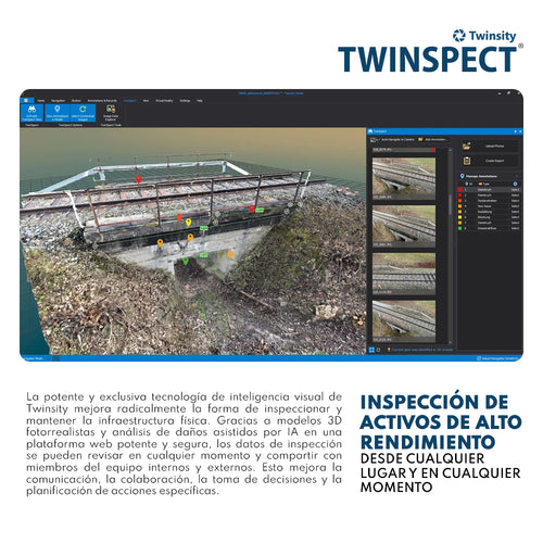 DESCRIPCIÓN Desde cualquier lugar y en cualquier momento La potente y exclusiva tecnología de inteligencia visual de Twinsity mejora radicalmente la forma de inspeccionar y mantener la infraestructura física. Gracias a modelos 3D fotorrealistas y análisis de daños asistidos por IA en una plataforma web potente y segura, los datos de inspección se pueden revisar en cualquier momento y compartir con miembros del equipo internos y externos. Esto mejora la comunicación, la colaboración, la toma de decisiones y la planificación de acciones específicas. Gemelos digitales visuales en la web Twinsity permite a los equipos de expertos acceder, inspeccionar y analizar de forma interactiva modelos de activos en 3D de alta fidelidad e imágenes de inspección con drones de alta calidad. Esto significa la máxima calidad y no se pasará por alto ningún detalle. Los activos complejos y masivos es el punto fuerte. CARACTERÍSTICAS TWINSITY • Modelos fotorrealistas en 3D Visualice, comparta y analice modelos 3D de fotogrametría altamente detallados de marcas líderes como Metashape, ContextCapture, Reality Capture y DJI Terra, sin pérdida de calidad y con máxima resolución. • Modelos 3D Georreferenciados Cargue modelos con información espacial exacta para una alineación precisa y la posibilidad de ver la ubicación de su modelo, imágenes relacionadas, anotaciones y detecciones de IA en el espacio de mapa de proyecto. • Detección de defectos asistida por IA Los potentes modelos de deep learning de la inteligencia artificial de última generación ayudan a los expertos a analizar imágenes RGB y modelos de realidad 3D para crear su propio modelo de IA basado en sus necesidades de detección. • Imágenes de inspección de alta resolución con drones Gestione, almacene y analice las imágenes de inspección de alta resolución en sincronización con los modelos de realidad 3D. De este modo, ayudamos a los técnicos expertos a mantener sus flujos de trabajo actuales. • Anotaciones personalizables Los equipos de inspección pueden definir plantillas de anotaciones personalizadas con sus propios atributos, campos y registros para admitir diversos formatos de registro y normas de inspección. • Informes de inspección detallados Generación automática de informes de inspección en diversos formatos que incluyen todas las anotaciones y mediciones pertinentes, así como imágenes de alta resolución y resúmenes. • Herramientas de anotación y medición Etiquetar y medir defectos y otros registros directamente en el modelo de realidad 3D o en las imágenes originales. Todos los registros se sincronizarán y etiquetarán en todas las imágenes y modelos 3D. VIDEOS DESCARGAS Descargar Datasheet